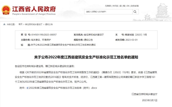 近日,江西省住房和城乡建设厅公布了《关于公布2022年度江西省建筑安全生产标准化示范工地名单的通知》,由中国地质EPC总承包实施的新余市吉泰·通达城项目荣获“2022年度江西省建筑安全生产标准化示范工地”。